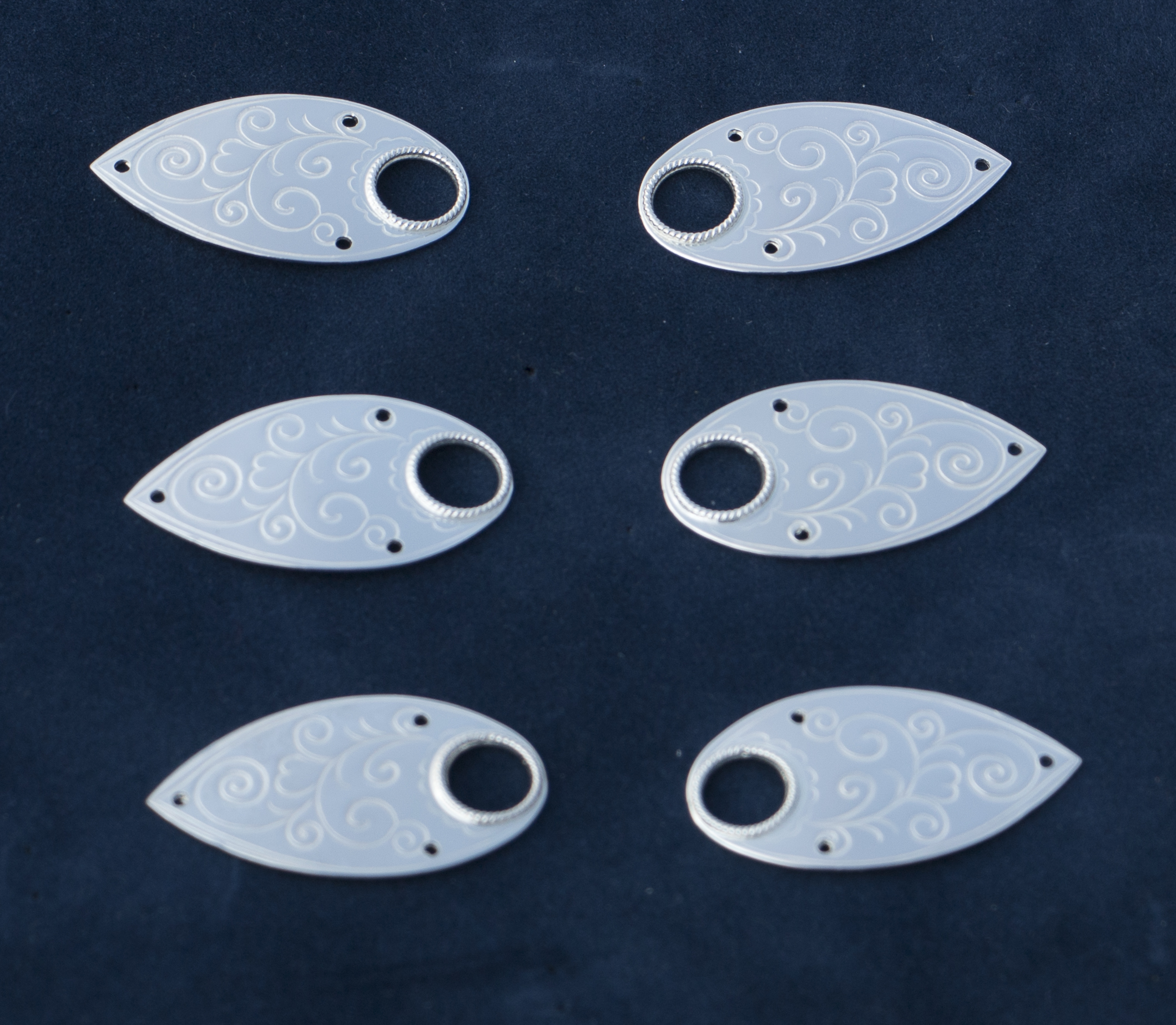 Sett m/ 6 maljer av sølv som sys på vesten. Kjede tres gjennom disse for å lukke vesten.